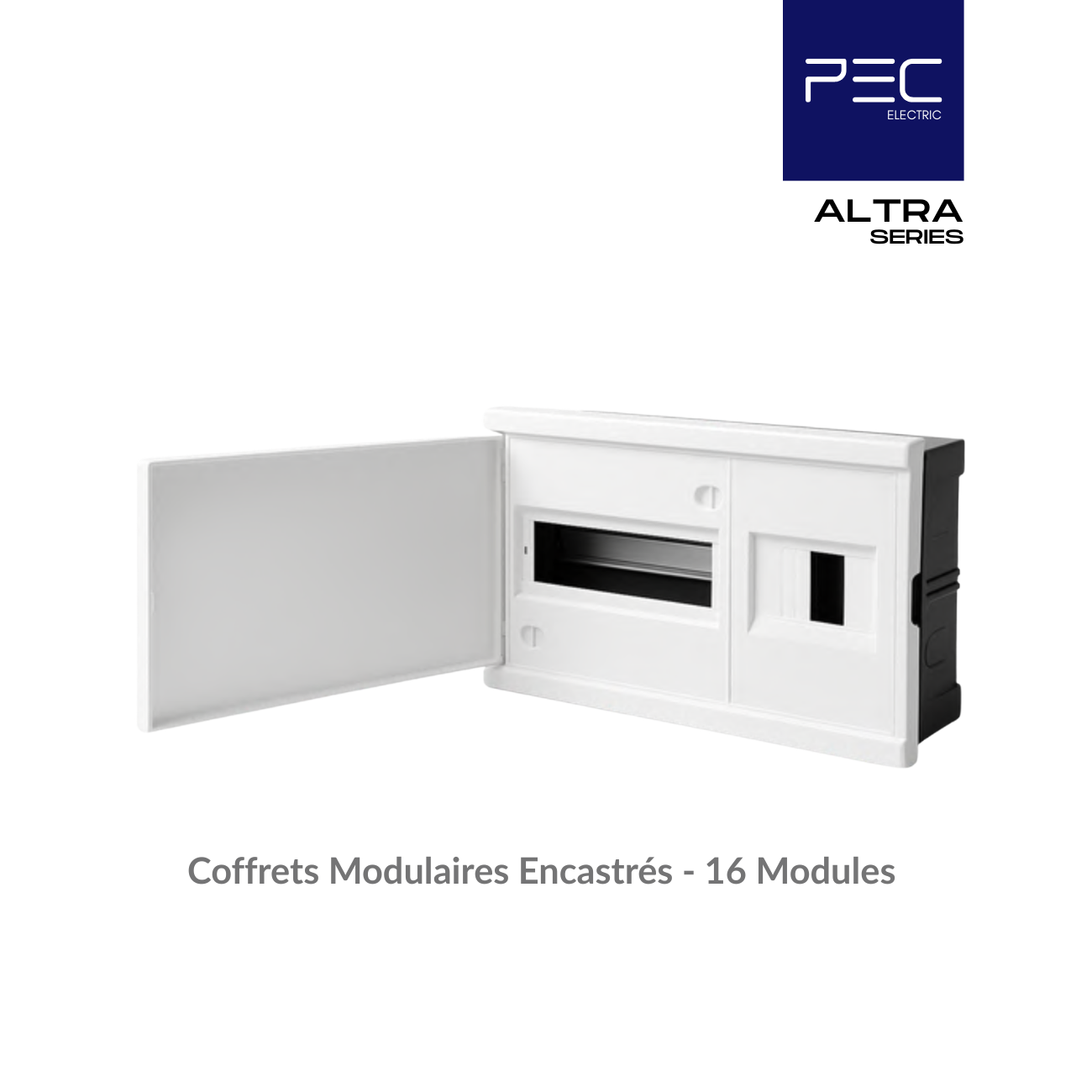 Le coffret modulaire encastré de la gamme ALTRA Series est la solution idéale pour vos projets électriques résidentiels et tertiaires au Maroc. Conçu par PEC, ce modèle 16 modules se distingue par sa conception robuste et sa finition soignée.