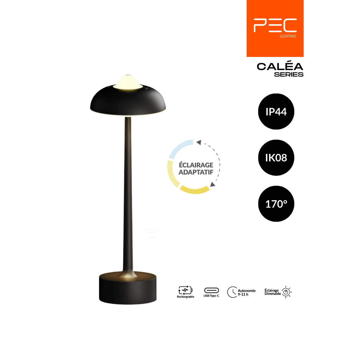 Rechargeable via USB Type-C, elle offre une autonomie de 9 à 11 heures, garantissant liberté d’utilisation sans contrainte. Sa conception robuste certifiée IP44 et IK08 assure durabilité et fiabilité pour un usage quotidien en intérieur comme en extérieur protégé.