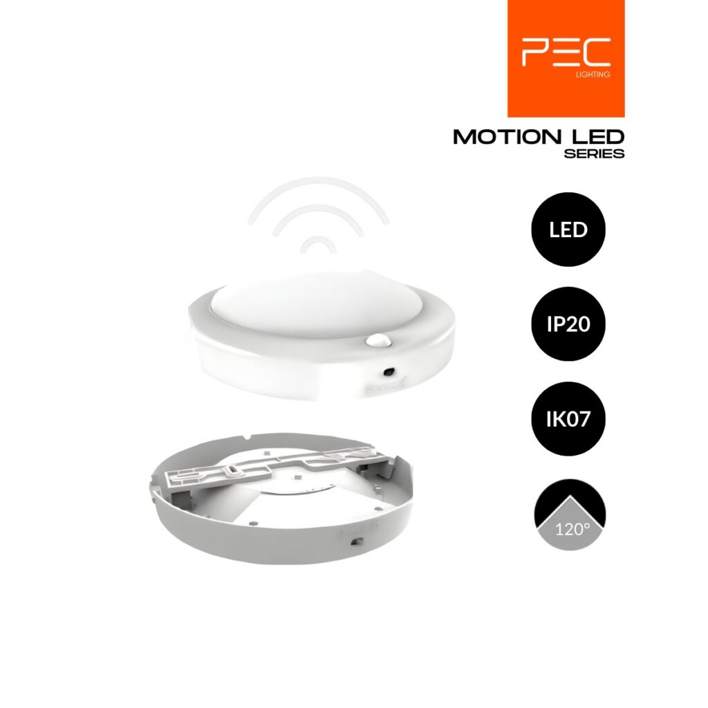 PEC Lighting présente la série MOTION LED, un plafonnier intelligent qui allie design épuré et technologie intégrée. Pensé pour les espaces intérieurs nécessitant un éclairage pratique et automatisé, il offre une solution moderne alliant confort, sécurité et efficacité énergétique.