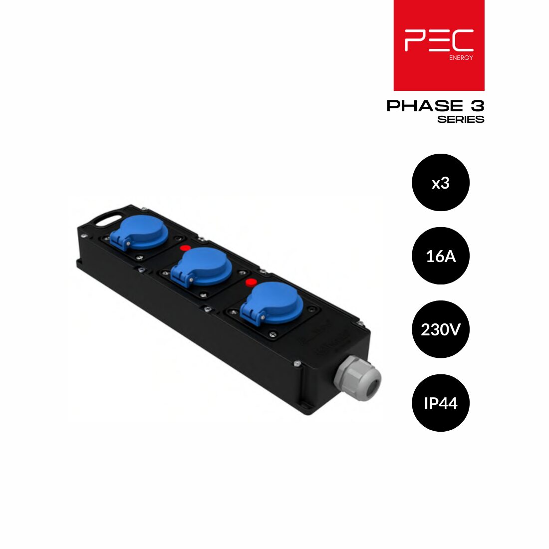 PHASE 3 de PEC est une solution de distribution électrique conçue pour les environnements exigeants nécessitant robustesse et sécurité. Équipée de 3 prises 16A – 230V AC, elle intègre des capots de protection étanchesgarantissant une utilisation sécurisée contre les projections d’eau et les poussières (IP44).